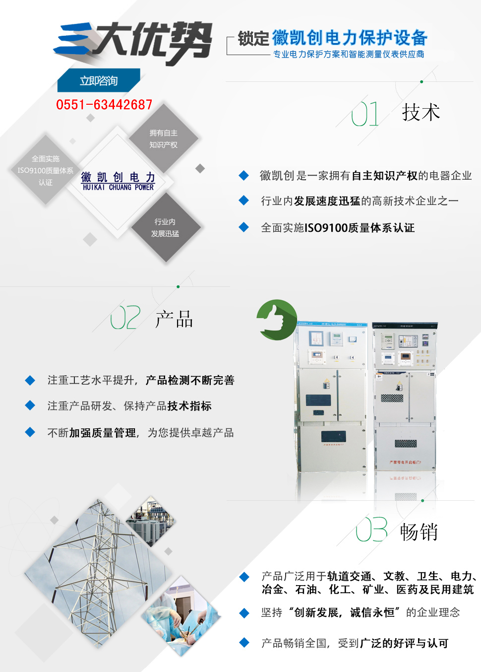 安徽徽凱創(chuàng)電力保護設備有限公司主要從事新型電氣設備、電子設備、智能控制技術的產品研發(fā)、生產、銷售。主要產品有:智能型消弧消諧裝置、消諧過電壓抑制柜、 組合式過電壓保護、智能型開關柜智能操控裝置、微機消諧、小電流選線、電弧光保護裝置、智能在線絕緣監(jiān)測裝置等電氣產品。 產品廣泛用于石化、煤炭、電力、建筑、市政、機場、鐵路、醫(yī)院、學校等領域,受到用戶一致好評。